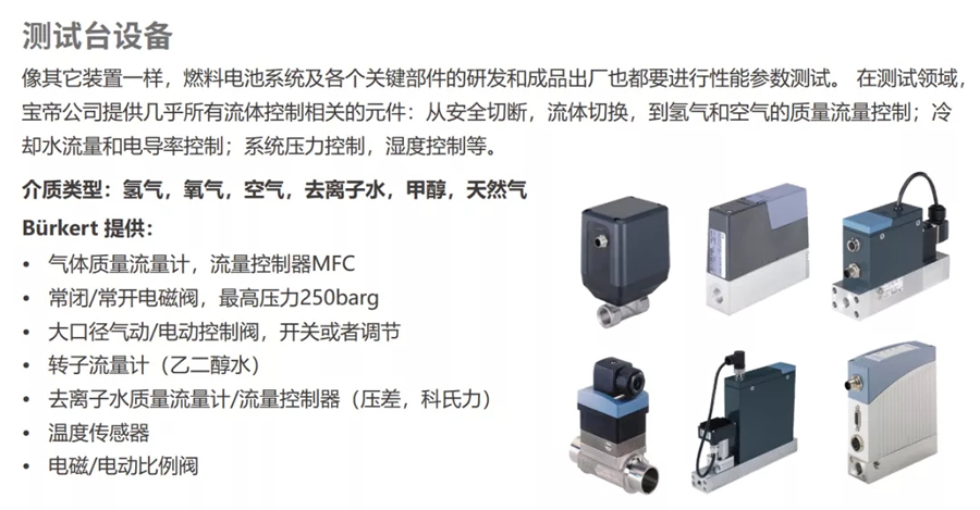 除了電池系統本身,我們公司還提供用于燃料電池測試臺架的幾乎所有流體控制相關的元器件,如氫氣、空氣的開關控制閥,H2、空氣的質量流量計和控制器, 冷卻水的調節控制閥,電導率傳感器,流量計,電磁比例閥和電動比例閥等。