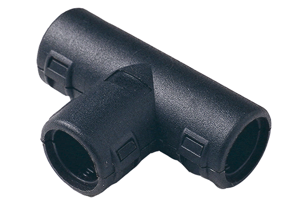 One-piece symmetrical 3 junction fittings allow a variety of conduit size variations. These fittings are designed to snap together over all types of Harnessflex slit and unslit conduit, maintaining maximum conduit bore