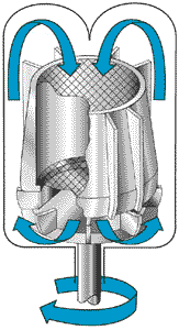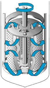 Popular reactor design circulates liquid reactants past a stationary catalyst bed. Impellers (1,000 rpm) draw fluid into the center of an annular catalyst basket
