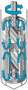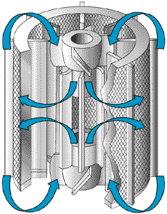 The design creates high circulation pressure & high mass transfer with low density gas. A 8" (200 mm) vane blower @ 2,500 rpm moves the gas past a stationary catalyst bed. Optional plating deactivates the reactor's surfaces