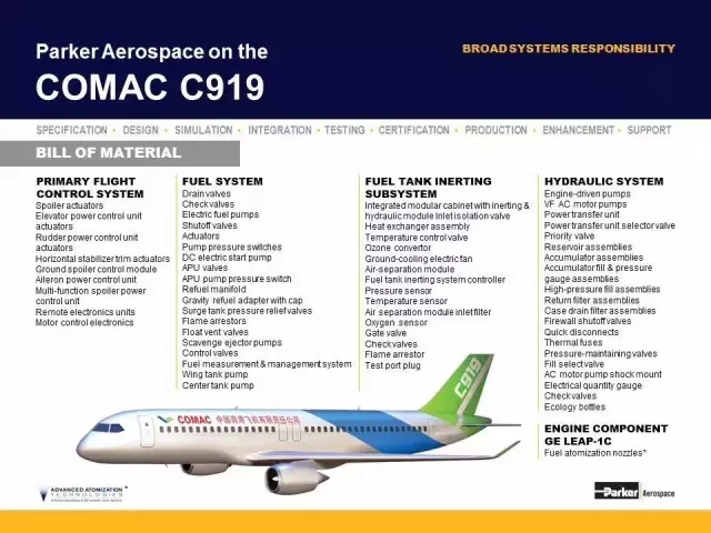 作為派克漢尼汾公司(NYSE:PH)旗下運營集團,Parker Aerospace派克宇航是C919大飛機液壓系統、主飛控作動系統、燃油系統和油箱惰化系統的供應商。