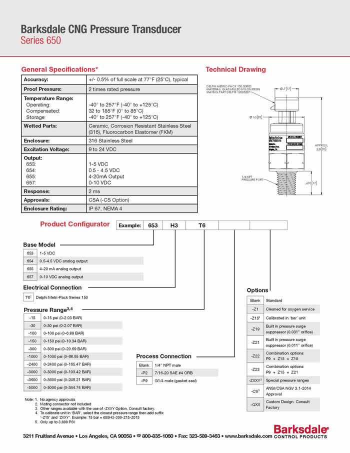Barksdale 650 Series CNG Pressure Transducer pdf catalog free download