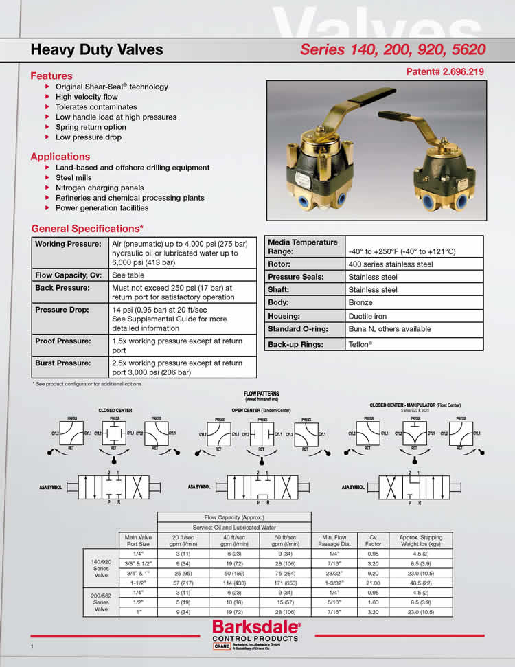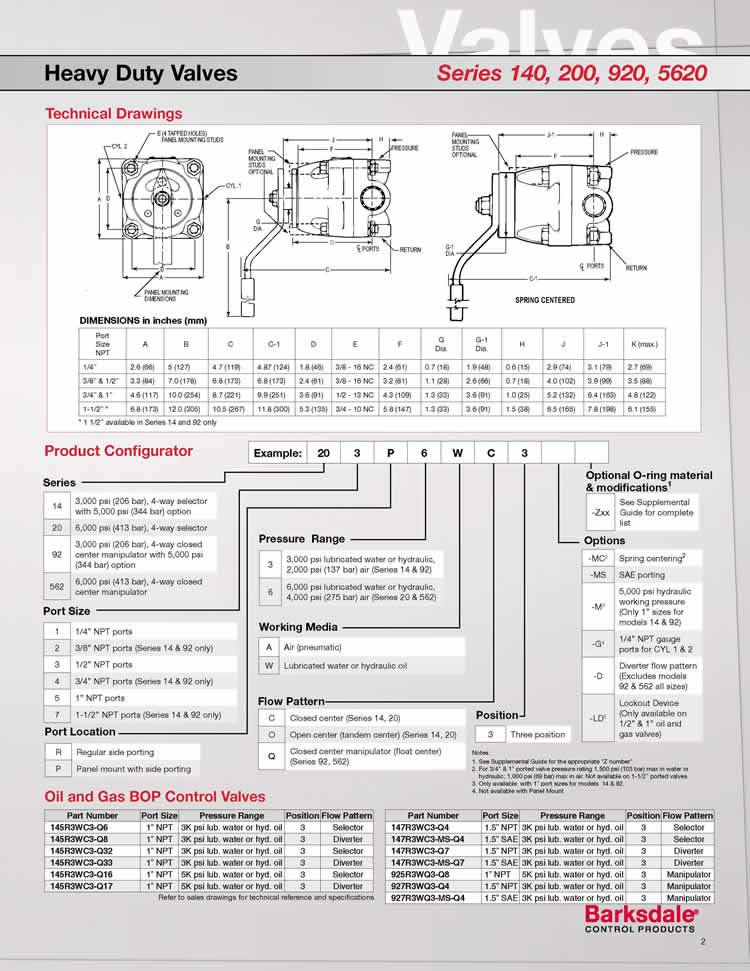 Barksdale Series 140, 200, 920, 5620手動控制換向閥