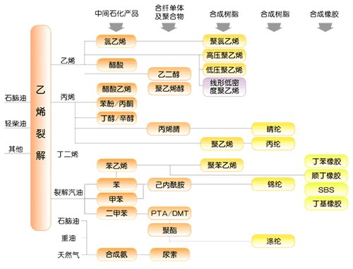 石油化工的范疇 以石油及天然氣生產(chǎn)的化學(xué)品品種極多、范圍極廣。石油化工原料主要為來(lái)自石油煉制過(guò)程產(chǎn)生的各種石油餾分和煉廠(chǎng)氣,以及油田氣、天然氣等。石油餾分(主要是輕質(zhì)油)通過(guò)烴類(lèi)裂解、裂解氣分離可制取乙烯、丙烯、丁二烯等烯烴和苯、甲苯、二甲苯等芳烴,芳烴亦可來(lái)自石油輕餾分的催化重整。石油輕餾分和天然氣經(jīng)蒸汽轉(zhuǎn)化、重油經(jīng)部分氧化可制取合成氣,進(jìn)而生產(chǎn)合成氨、合成甲醇等。從烯烴出發(fā),可生產(chǎn)各種醇、酮、醛、酸類(lèi)及環(huán)氧化合物等。隨著科學(xué)技術(shù)的發(fā)展,上述烯烴、芳烴經(jīng)加工可生產(chǎn)包括合成樹(shù)脂、合成橡膠、合成纖維等高分子產(chǎn)品及一系列制品,如表面活性劑等精細(xì)化學(xué)品,因此石油化工的范疇已擴(kuò)大到高分子化工和精細(xì)化工的大部分領(lǐng)域。石油化工生產(chǎn),一般與石油煉制或天然氣加工結(jié)合,相互提供原料、副產(chǎn)品或半成品,以提高經(jīng)濟(jì)效益。