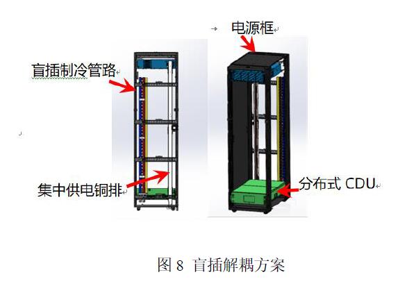 盲插解耦方案采用標準機柜、盲插制冷管路、集中供電模塊,可選配分布式 CDU 及無源風液換熱器,有效提升功率密度,降低 PUE,節省布線空間,提高上架率。主要內容包括: