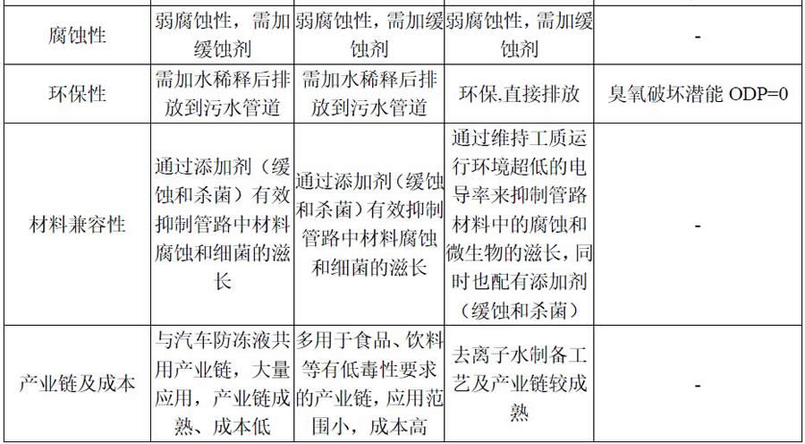 去離子水具有良好的傳熱性能,超低電導率、制備工藝成熟,無毒安全,可作為冷卻液備選之一,但需注意對冷卻液的維護。去離子水的冰點為 0℃,需考慮運輸、儲存、短時停機、業務量較少、服務器已安裝未運行等情況下防凍問題。