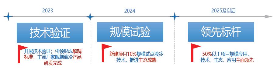 2023 年開展技術驗證,充分驗證液冷技術性能,降低 PUE,儲備規劃、建設與維護等技術能力;2024 年開展規模測試,推進液冷機柜與服務器解耦,促進競爭,推進產業生態成熟,降低全生命周期成本;至 2025年,開展規模應用,共同推進形成標準統一、生態完善、成本最優、規模應用的高質量發展格局,電信行業力爭成為液冷技術的引領者、產業鏈的領航者、推廣應用的領先者。