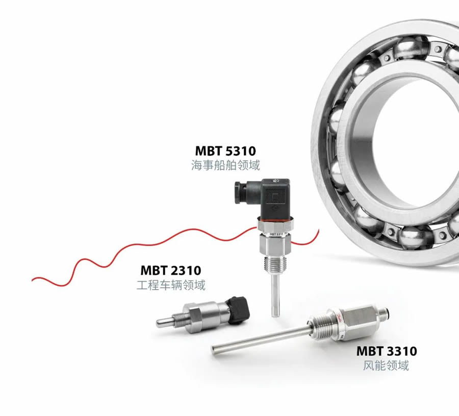 特點與優勢 - 優質性:所有的設計都是基于Pt 100 / Pt 1000 / NTC 技術,傳感器的護管和護套的材質均為不銹鋼AISI 316Ti。 - 可靠性:彈簧式、自調節護管確保軸承和傳感器之間在任何時候都可以金屬接觸。溫度范圍-50 ~ 200°C。 - 高性能:傳感器感溫元件位于護管的最末端,可以實現對溫度變化的快速反應,縮短響應時間。 - 堅固性:無焊接一體式不銹鋼外殼確;趬勖A 期的低服務成本(更少的維護間隔)和更長的使用壽命(適用于MBT 2310和MBT 3310)。 - 創新性:傳感器體積小巧,可從頂部實現便捷安裝 (適用于MBT 3310) - 船級社認證:MBT 5310具備所有相關船級社認證,以確保用更少的文件來降低管理成本,并簡化設計過程 - 專業的應用經驗和伙伴關系:我們以數十年的經驗和深厚的軸承應用洞察力為基礎,提供最廣泛的專 用軸承溫度傳感器產品組合。