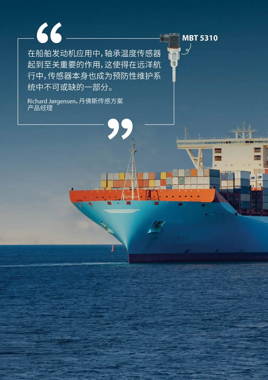 發動機是商業船舶應用系統的心臟,負責推進與發電,來確保船只穩定航行。發動機是大型且運行工況更為復雜的設備,在惡劣的環境下,軸承很有可能發生過熱現象。在船舶中,例如軸承溫度傳感器直接安裝在發動機上,使得傳感器暴露在不斷變化的環境溫度和飛濺的油品下。這兩個因素會極大地影響軸承溫度,還有更多的影響因素需要被考慮到。 丹佛斯傳感方案產品經理Richard J- rgensen表示:“在船舶發動機應用中,軸承溫度傳感器起到至關重要的作用,這使得在遠洋航行中,傳感器本身也成為預防性維護系統中不可或缺的一部分! 當考慮為船舶應用選擇軸承溫度傳感器時,防護等級、軸承和傳感器元件之間的安全接觸、以及可靠的質量,是確保發動機軸承溫度被連續、 準確監測的關鍵條件。
