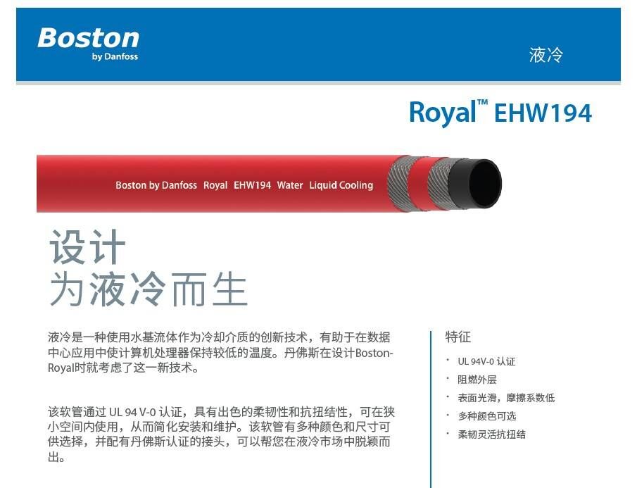 液體冷卻是一種創新技術,使用水作為冷卻介質,以幫助在數據中心應用中保持計算機處理器的低溫。丹佛斯設計Boston Royal時考慮到了這一新興技術。UL 94 V-0等級,具有卓越的靈活性和抗扭結性,該軟管設計用于在狹小空間中操作,以簡化安裝和維護。我們提供各種尺寸和顏色,并配有經批準的丹佛斯配件,因此很容易進入這個新市場。