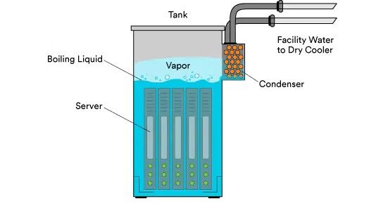在兩相浸沒(méi)式冷卻中,流體被煮沸和冷凝,傳熱效率成倍增加。電子元件直接浸入密封但易于接近的外殼中的介電液體中,電子元件的熱量使流體沸騰,產(chǎn)生從液體中升起的蒸汽。蒸汽在儲(chǔ)罐內(nèi)的熱交換器(冷凝器)上冷凝,將熱量傳遞到流出數(shù)據(jù)中心的設(shè)施水中。
