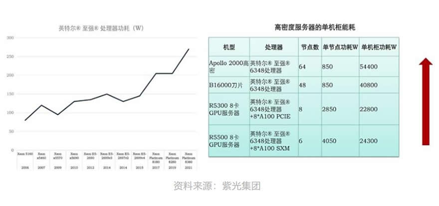 ODCC《冷板式液冷服務器可靠性白皮書》信息,2022年Intel第四代服務器處理器單CPU功耗已突破350瓦,英偉達單GPU芯片功耗突破700瓦,AI集群算力密度普遍達到50kW/柜。