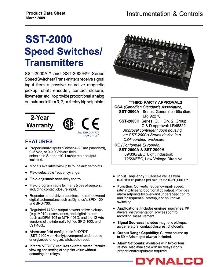 SPEED TRANSMITTER, CSA General Classification and CE approved.Receives signal input from a passive or active magnetic pickup, shaft encoder, contact closure, flowmeter, etc. to provide proportional analog outputs.SST-2000A/H series is a highly configurable product.