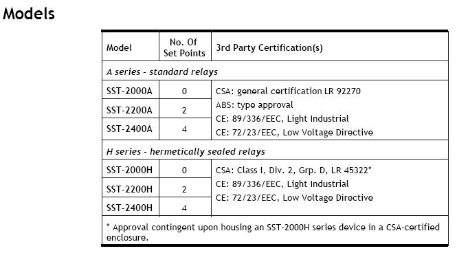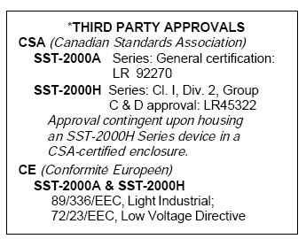 | * Approval contingent upon housing an SST-2000H series device in a CSA-certified enclosure. |