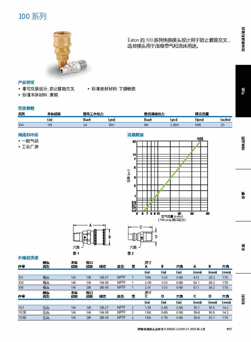 Eaton 的 100系列快換接頭設計用于防止管路交叉,這些接頭用于壓縮空氣和流體用途。