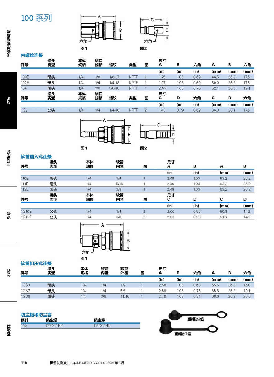 100E 母頭 1/4 1/8 1/8-27 NPTF 1 1.75 1.03 0.69 44.5 26.2 17.5
