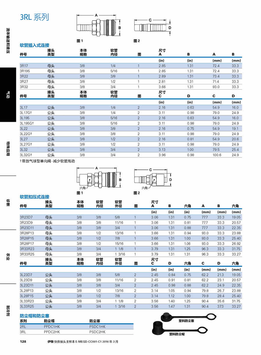 3L27G.公頭 3/8 3L32 公頭 3/8 3L32G.公頭 3/8 .帶放氣球型單向閥 -減少軟管甩動軟管扣壓式連接接頭本體件號類型規(guī)格圖 1 軟管內(nèi)徑 1/2 3/4 3/4 軟管外徑 2 2 2 圖圖 2 3.11 3.13 3.96 尺寸 A B 0.98 1.00 0.98 六角 A 79.0 79.5 100.6 B 24.9 25.4 24.9 六角