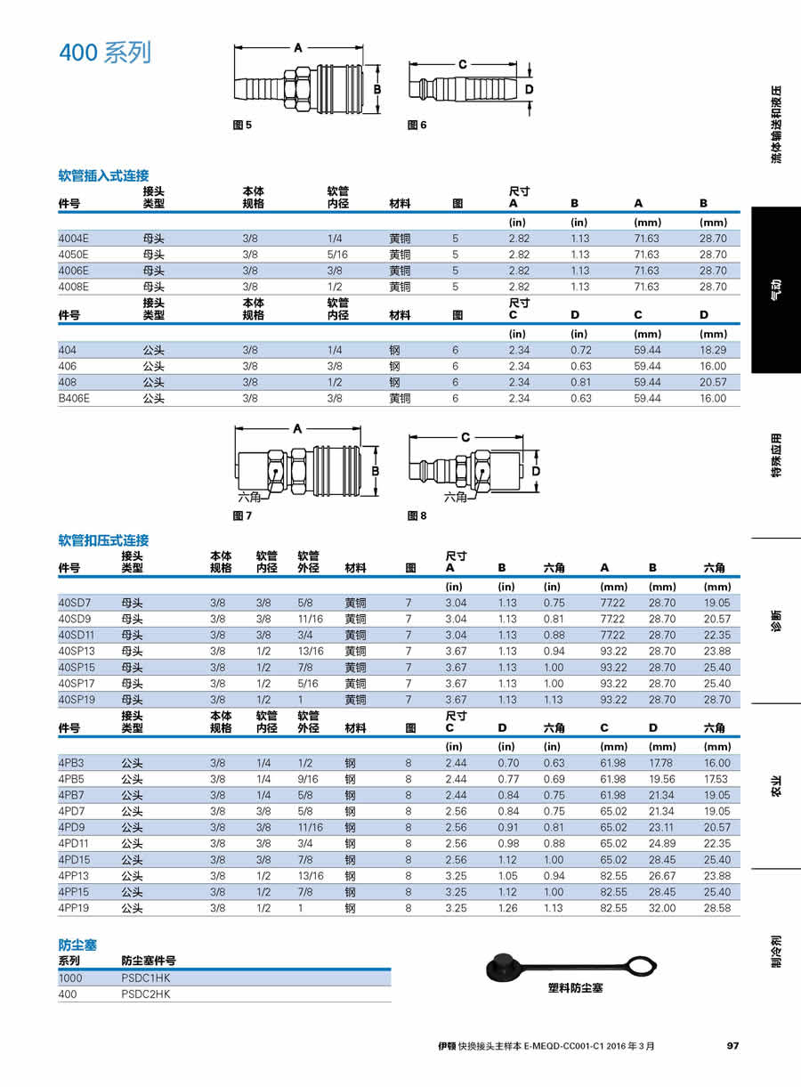 406 公頭 408 公頭 B406E 公頭 軟管扣壓式連接接頭件號類型 3/8 3/8 3/8 本體軟管規(guī)格內(nèi)徑圖 7 軟管外徑 3/8 1/2 3/8 材料 鋼 鋼 黃銅 圖圖 8 6 6 6 尺寸 A 2.34 2.34 2.34 B 0.63 0.81 0.63 六角 A 59.44 59.44 59.44 B 16.00 20.57 16.00六角