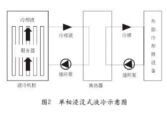 如圖2所示,在單相浸沒式液冷中,冷卻液與服務器熱源直接進行對流換熱,利用冷卻液的顯熱吸收服務器產(chǎn)生的熱量,同時通過循環(huán)泵使加熱后的冷卻液進入換熱器與溫水進行循環(huán)流動換熱,將電子元件產(chǎn)生的熱量通過換熱器傳遞給外部冷卻設備,末端外部冷卻側設備一般采用冷卻塔或干冷塔等進行自然冷卻,將熱量傳遞到環(huán)境中,整個過程中冷卻介質(zhì)沒有發(fā)生相變過程。阿里巴巴浙江仁和數(shù)據(jù)中心采用單相浸沒液冷技術,將IT設備浸沒在絕緣氟化液中,實現(xiàn)數(shù)據(jù)中心年均能源使用效率PUE不高于1.09。另一實例是網(wǎng)宿科技研發(fā)的DLC直接浸沒式液冷技術,其最大的特點在于采用自研的礦物油作為浸沒液體的冷卻液,雖然無相變換熱效率相對較低,但是成本低維護相對簡易。