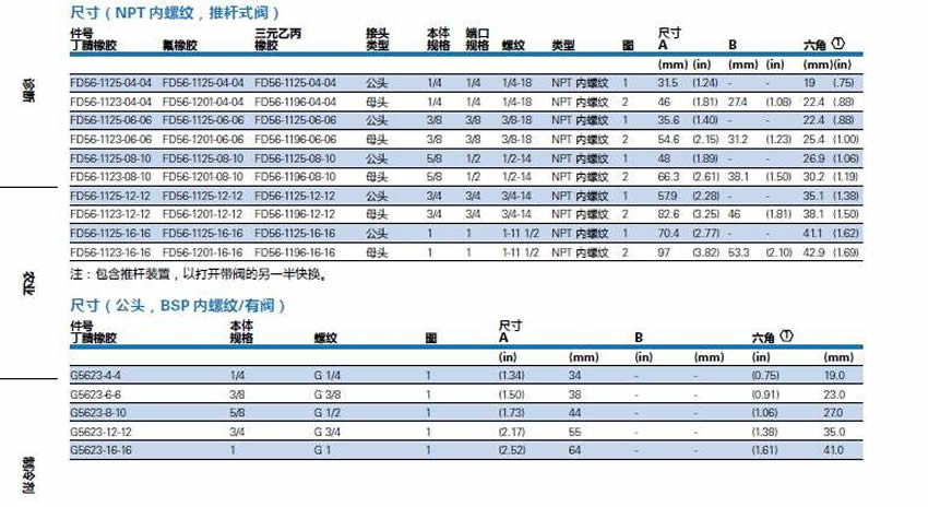 FD56-1226-06-06 FD56-1208-06-06 FD56-1205-06-06 Complete 3/8 3/8 3/8-18 Female NPT 3 71.1 (2.80)FD56-1037-08-10 FD56-1037-08-10 FD56-1037-08-10 Male 5/8 1/2 1/2-14 Female NPT 1 48 (1.89) --26.9 (1.06)