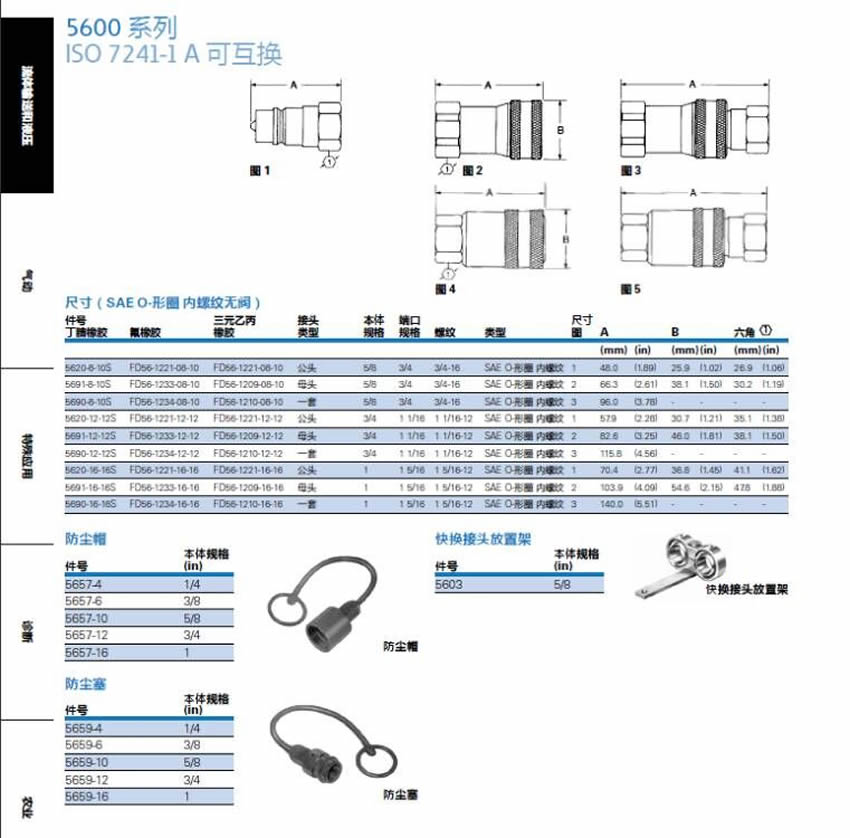 伊頓 5600 系列是一種堅(jiān)固的提升式球鎖快速斷開(kāi)接頭。作為 ISO 7241-1 A 型接頭的原始制造商,伊頓重新發(fā)明了這個(gè)快速斷開(kāi)接頭系列,通過(guò)提供新的不銹鋼結(jié)構(gòu)來(lái)滿足您的應(yīng)用需求。不銹鋼結(jié)構(gòu)在惡劣的環(huán)境中提供出色的耐腐蝕性。 5600 系列不銹鋼快速接頭。The 5600 Series general purpose industrial interchange coupling features a PUSH-PULL latch and poppet valving in a low profile design. The 5600 Series features a rugged ball latch mechanism with self-sealing poppet valves in a wide array of port configurations and multiple valved and non-valved configurations.