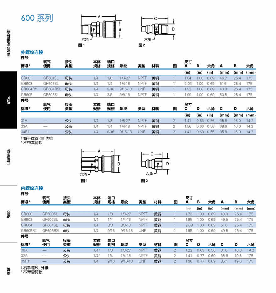 - 系列 600 接頭不能用于壓力超過 100 psig 的氧氣。