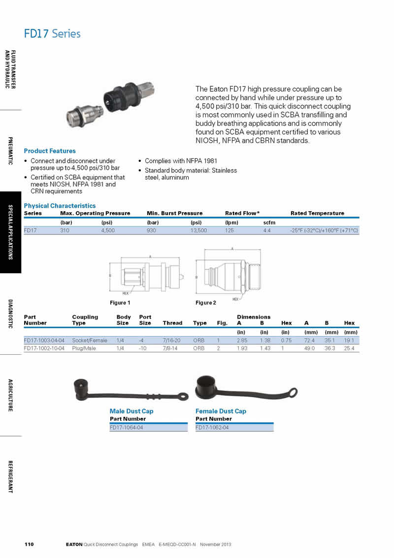 Eaton FD17系列高壓快速接頭設(shè)計用于適于吸入的空氣transfilling的應(yīng)用。使用在SCBA設(shè)備證明了到NIOSH、NFPA和CBRN標(biāo)準(zhǔn)。該系列的前身為 Aeroquip FD17 品牌,是一種高壓接頭,可在高達(dá) 4,500 psi/310 bar 的壓力下手動連接。特點包括在高達(dá) 4,500 psi/310 bar 的壓力下連接和斷開;通過符合 NIOSH、NFPA 1981 和 CRN 要求的 SCBA 設(shè)備認(rèn)證 符合 NFPA 1981。FD17高壓接頭應(yīng)用包括:SCBA 換氣和伙伴呼吸應(yīng)用等。 Eaton FD17 high pressure coupling can be connected by hand while under pressure up to 4,500 psi/310 bar. This quick disconnect coupling is most commonly used in SCBA transfilling and buddy breathing applications and is commonly found on SCBA equipment certified to various NIOSH, NFPA and CBRN standards.