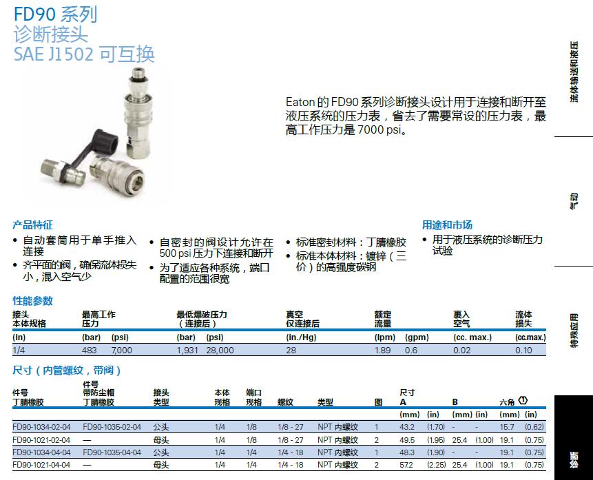 Eaton 的 FD90 系列診斷接頭設計用于連接和斷開至液壓系統的壓力表,省去了需要常設的壓力表,最高工作壓力是 7000 psi。Eaton FD90 Series diagnostic coupling is designed to connect and disconnect pressure gauges to hydraulic systems, eliminating the need for permanent gauges. The maximum operating pressure is 7,000 psi.