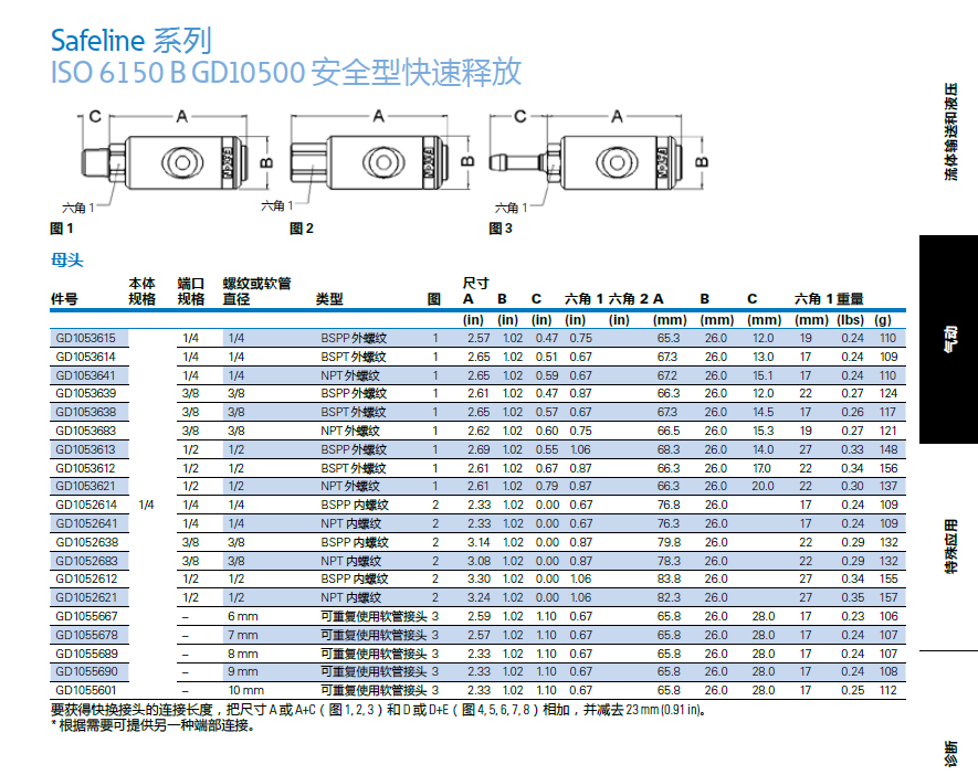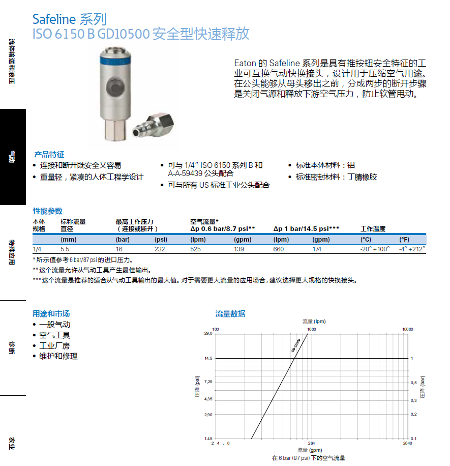 Eaton的 Safeline系列是具有推按鈕安全特征的工業可互換氣動快換接頭,設計用于壓縮空氣用途。在公頭能夠從母頭移出之前,分成兩步的斷開步驟是關閉氣源和釋放下游空氣壓力,防止軟管甩動。Eaton’s Safeline Series is an Industrial Interchange pneumatic coupling with push button safety feature designed for use with compressed air- Two-step disconnect procedure shuts off air supply and releases downstream air pressure before plug can be removed from socket/female, which prevents hose whip.