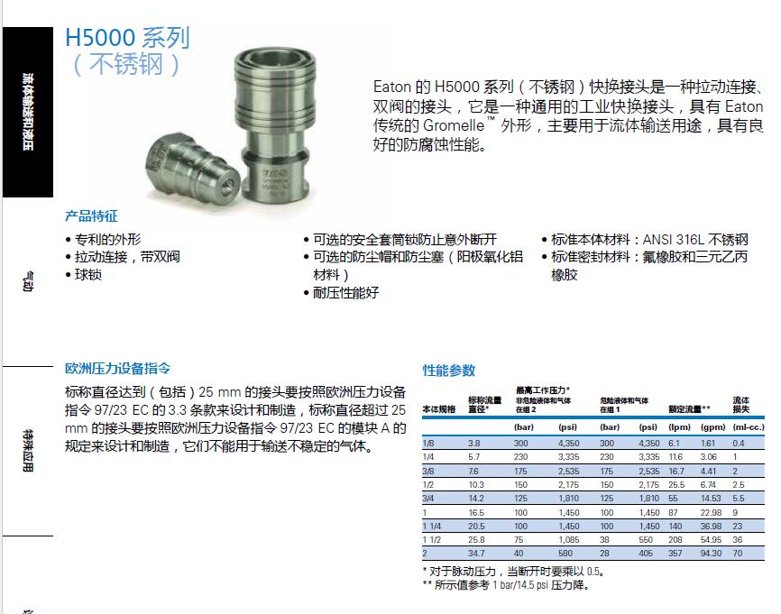 Eaton的 H5000系列(不銹鋼)快換接頭是一種拉動連接、雙閥的接頭,它是一種通用的工業快換接頭,具有 Eaton傳統的 Gromelle .外形,主要用于流體輸送用途,具有良好的防腐蝕性能。 Eaton H5000 Series stainless steel quick disconnect coupling is a pull to connect double shut-off coupling. It is a general purpose industrial coupling with the original Eaton’s Gromelle? profile. It is mainly used in fluid transfer applications and provides excellent corrosion resistance.