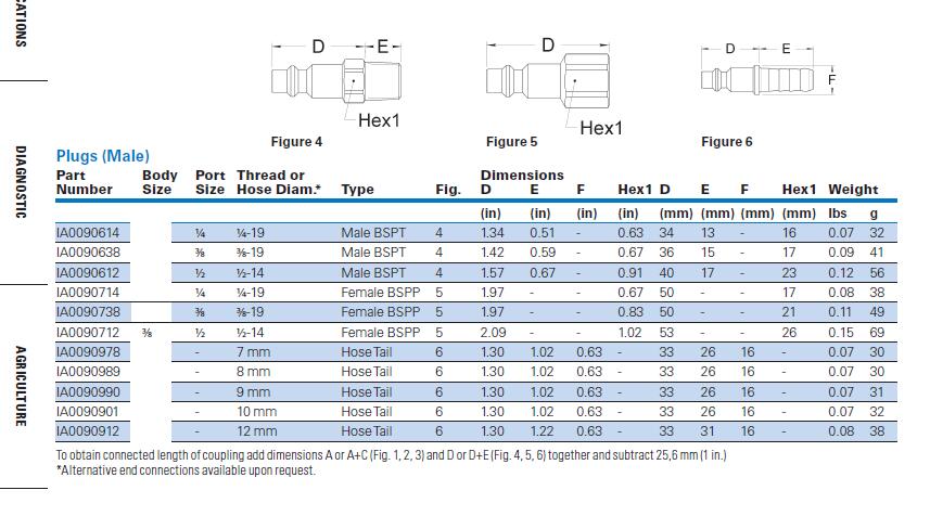 Number Size Size Hose Diam.* Type Fig. D E F Hex1 D E F Hex1 Weight