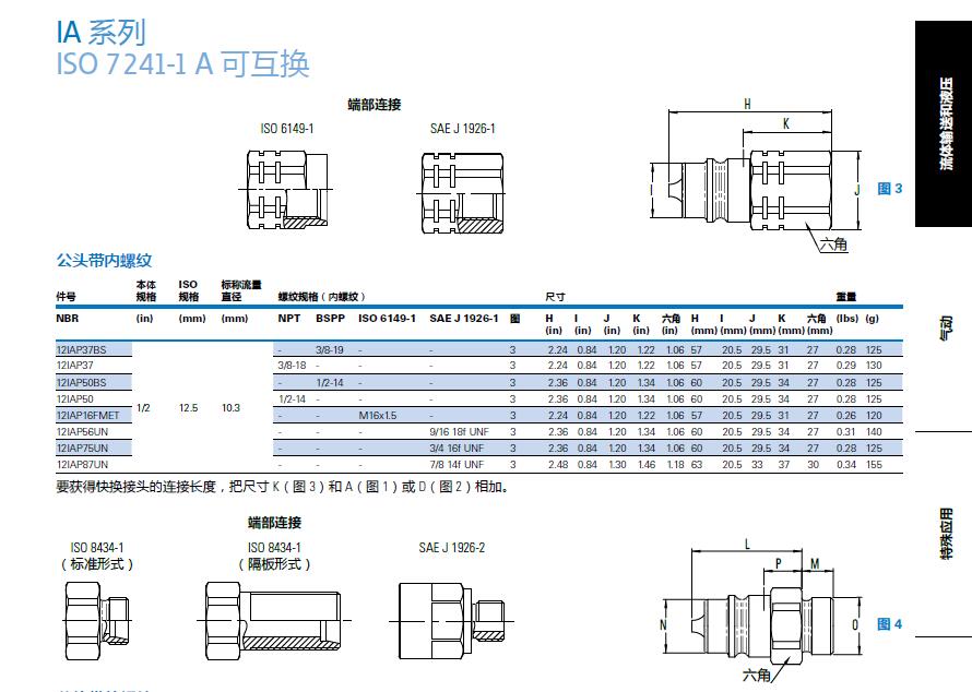 IA系列滿足 ISO 7241-1系列 A標準要求并且具有推 -拉結構設計,允許母頭隔板安裝。該配置通過公頭的簡單推或拉,提供自動連接或斷開。我們的 IA系列 1/2”規格可提供內螺紋和外螺紋連接型式,如公制螺紋、 NPT或 SAE螺紋。它們廣泛用于農業和林業用途。 The IA Series meets ISO 7241-1 A Standard requirements and has a push-pull design, which allows the socket to be bulkhead-mounted. This configuration provides automatic connection or disconnection via a simple push or pull of the plug. Our IA