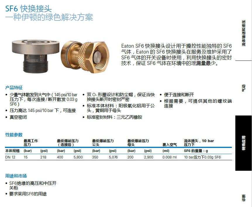 Eaton SF6快換接頭設計用于操控性能獨特的 SF6氣體, Eaton的 SF6快換接頭在服務及維護采用了 SF6氣體的開關設備時使用,利用快換接頭的密封技術,保證 SF6氣體在環境中的泄漏量最少。