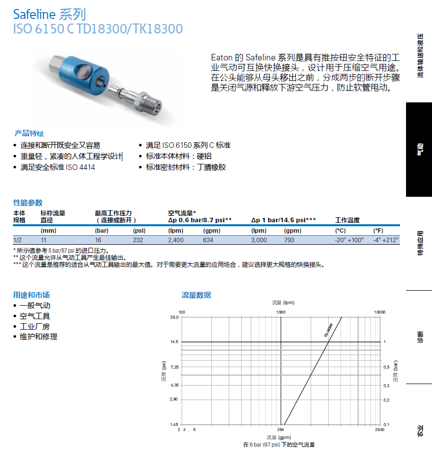 這個流量是推薦的適合從氣動工具輸出的最大值。對于需要更大流量的應用場合,建議選擇更大規格的快換接頭。