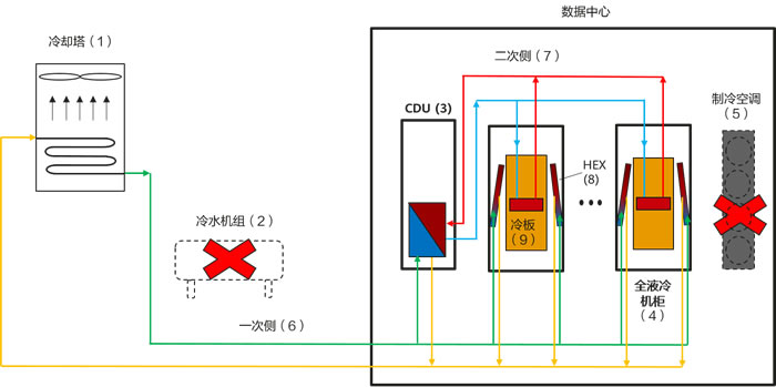 全液冷系統(tǒng)由一次側(cè)與二次側(cè)兩部分組成: