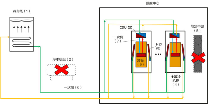 用來(lái)為IT機(jī)柜進(jìn)行散熱的設(shè)備,華為全液冷機(jī)柜熱量由水帶走,因此可以取消絕大部分為IT設(shè)備散熱配置的專用的制冷空調(diào)。 |