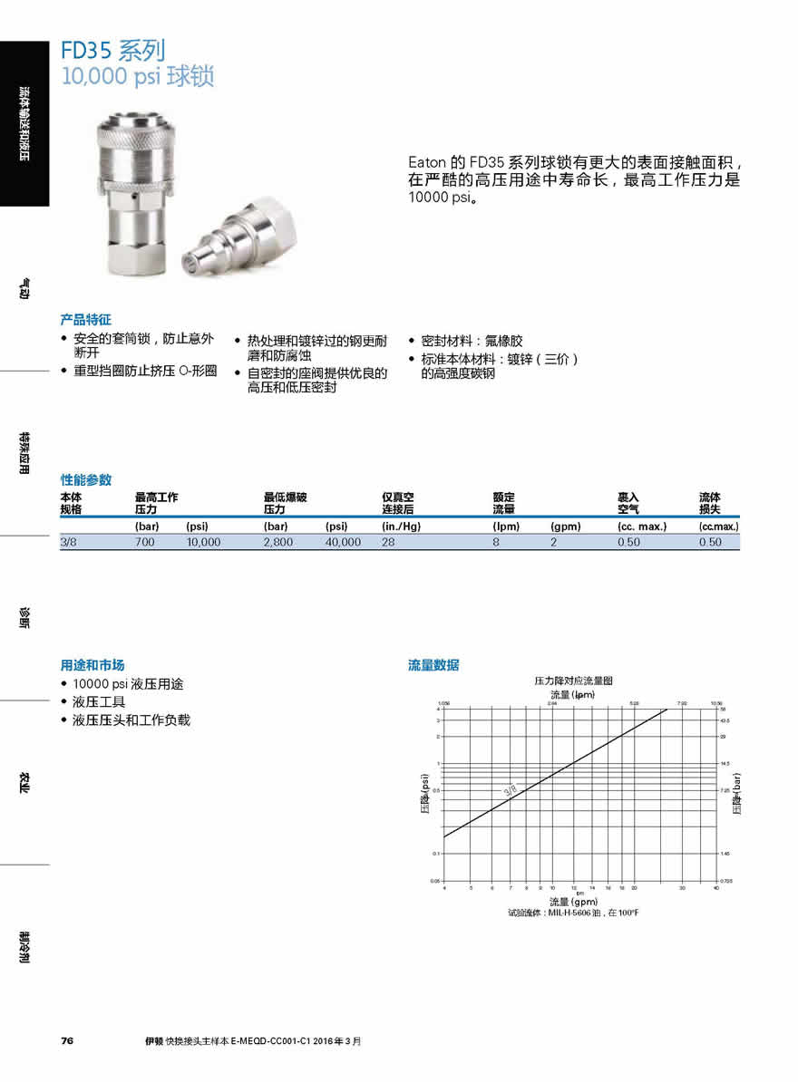 Eaton的 FD35系列球鎖有更大的表面接觸面積,在嚴(yán)酷的高壓用途中壽命長(zhǎng),最高工作壓力是 10000 psi。FD35 Series Arc Latch design has a greater surface contact area for long surface life in rugged high pressure applications. The maximum operating pressure is 10,000 psi.- Safety sleeve lock prevents accidental disconnection.