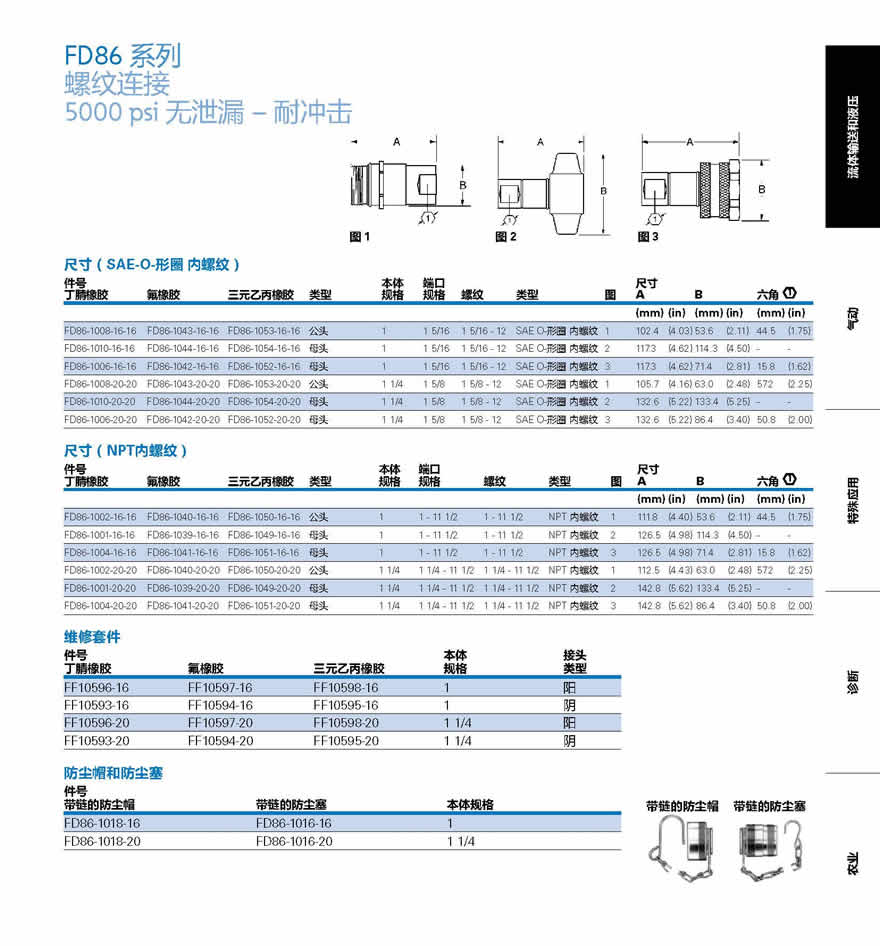 Eaton的 FD86系列是螺紋連接鋼制快換接頭,具有無泄漏和耐沖擊的能力,最高工作壓力是 5000 psi,FD86系列可提供帶翼螺母或六角螺母的配置,便于裝配和拆卸。(有關更高壓力用途和另外的規格要求,參考 48頁的 FD96系列。)Eaton’s FD86 Series is a thread together steel quick coupling offering dry break and high impulse technology and capabilities. The maximum operating pressure is 5,000 psi. The FD86 Series is available in either wing nut or hex nut configurations for ease of assembly and disassembly. (For higher pressure applications and additional size requirements, refer to FD96 on page 44.)