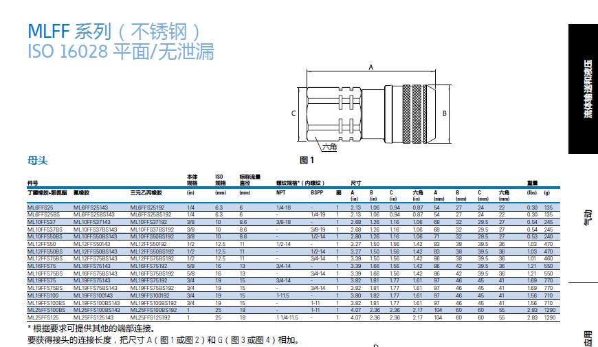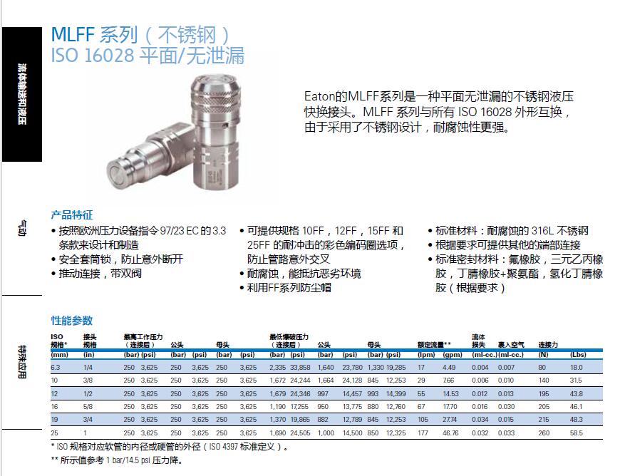 伊頓的MLFF系列不銹鋼快速接頭是一種用于液壓應(yīng)用的平面干式快速接頭。MLFF系列與所有ISO 16028型材互換。由于其不銹鋼設(shè)計(jì),它是耐腐蝕的,可以處理侵蝕性環(huán)境。Eaton’s MLFF Series stainless steel coupling is a flat face dry break coupling used for hydraulic applications. The MLFF Series interchanges with all ISO 16028 profiles. Due to its stainless steel design, it is corrosion resistant and can handle aggressive environments.