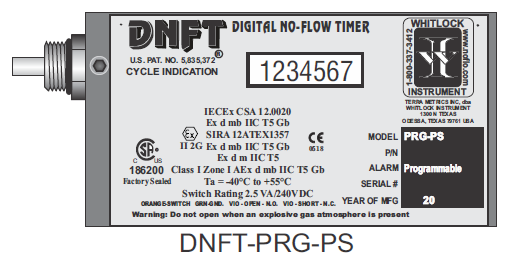 The DNFT-PRG is a totally enclosed electronic device, combining the latest technology in microprocessor and transistor components for detecting Slow-Flow and No-Flow of divider block lubrication systems. The DNFT incorporates an oscillating crystal to accurately monitor the cycle time of the lubrication system to enable precisely timed shutdown capability. The magnet assembly and control housing mount directly to the divider valve to become an integral part of the lubrication system. The DNFT-PRG operates on field replaceable lithium battery. If battery voltage drops below normal operating levels, the DNFT goes into alarm mode and the unit cannot be restarted. The PRG utilizes a LED to indicate each cycle of the divider valve. This enables the operator to easily set and monitor lubrication rates. The PRG comes with a liquid crystal display to display total pints, cycle time of divider valve, total cycles of divider valve, and pints per day pump rate. The PRG can easily be programmed for an alarm time from 20 seconds to 4minutes 15 seconds.
