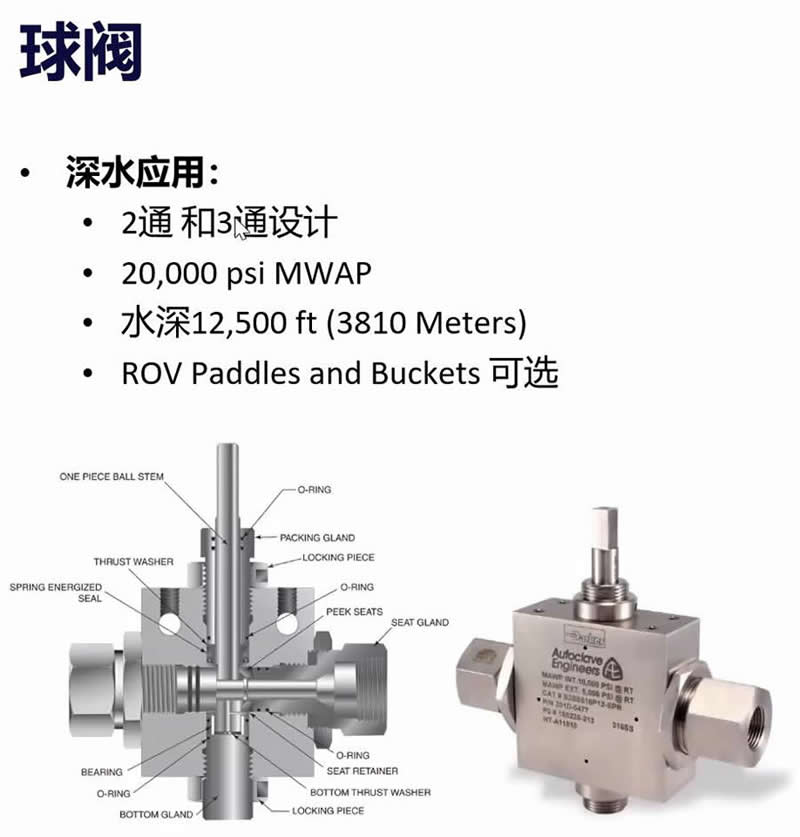 用于海底作業(yè)的高壓海底球閥。壓力達(dá) 20,000 psi (1379 bar),水深達(dá) 12,500 英尺(3810 米) . 派克 Autoclave 的高壓海底球閥能夠在 20,000 psi (1379 bar) 和 12,500 英尺(3810 米)的深度下工作,尺寸有 3/16"、1/4"、3/8" 和 1/2" . 標(biāo)準(zhǔn)球閥采用 316 不銹鋼制成,并提供特殊材料。我們獨(dú)特的設(shè)計(jì)創(chuàng)新包括一體式耳軸安裝球和閥桿,消除了兩件式設(shè)計(jì)中常見(jiàn)的剪切失效,可重新擰緊的閥座壓蓋可延長(zhǎng)閥座壽命,以及更低摩擦的閥桿密封件,可降低驅(qū)動(dòng)扭矩并提高循環(huán)生活。
