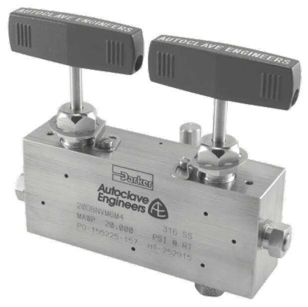 Parker Autoclave's 20DBNV Series double block and bleed needle valves are a three system manifold valve providing an economical and convenient method of blocking, bleeding and calibrating pressure transmitters and gauges. The valve utilizes standard valve packing and stem design making it compact and easy to use.