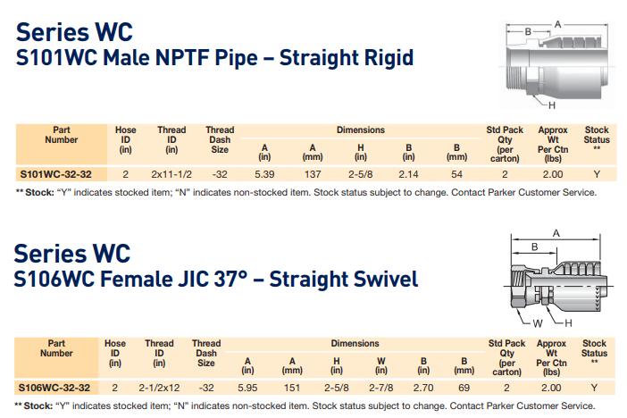 Parker's Series WC Permanent Crimp Couplings/Fittings are designed and machined to close tolerances for accurate and reliable performance. The couplings are available in multiple end styles for versatility, and are stamped for easy identification.