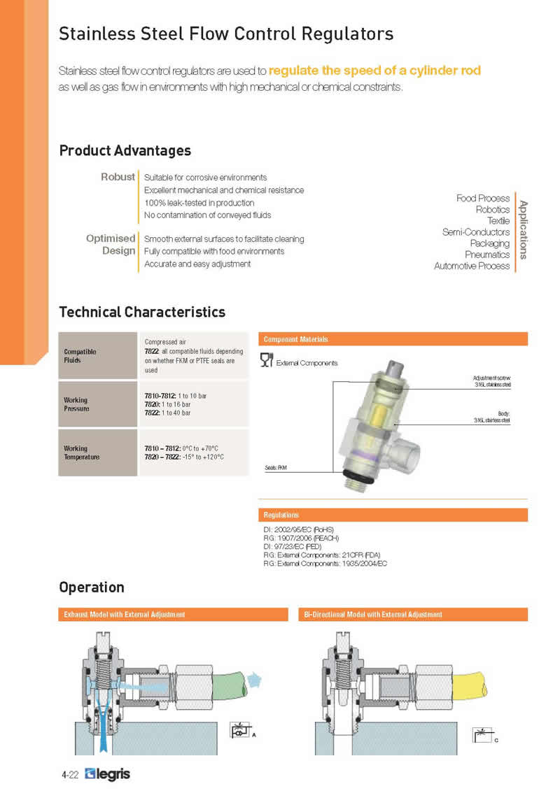 Stainless steel flow control regulators are used to regulate the speed of a cylinder rod as well as gas flow in environments with high mechanical or chemical constraints. Stainless steel flow control regulators are used to regulate the speed of a cylinder rod as well as gas flow in environments with high mechanical or chemical constraints. Those regulators are suitable for food environment as they ensure no contamination of conveyed fluids. The design is optimised by using smooth external surfaces in order to facilitate your cleaning processes.