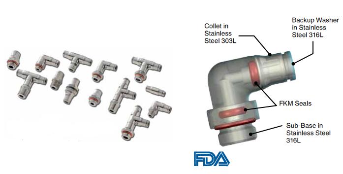 Parker's PLS push-to-connect pneumatic fittings conforms to FDA standards permitting permanent contact with food and other aggressive environments. Being the world's leader in push-to-connect fitting technology Parker's Prestolok PLS stainless steel tube fittings extend Parker's expertise from pneumatics to the food industry. Fittings that come in contact with food must be corrosion resistant, non-toxic, non-absorbent and capable of being washed down and disinfected. Parker's Prestolok PLS fittings have a 316L stainless steel body and washer and a 303L stainless steel collet. The Prestolok PLS fitting uses nutriment grade materials and USDA NSF H1 grease conforming to FDA standards, permitting permanent contact with food. Prestolok PLS has a hygienic design aimed at reducing retention zones for safe and easy cleaning. Prestolok PLS fittings are fitted with an FKM O-ring protected by a backup washer. Prestolok PLS push in connectors reduce assembly time by eliminating the use of a sleeve and tightening of a nut required in compression style fittings. All components in Prestolok PLS are silicone free. All Prestolok PLS fittings are 100% leak tested and date coded to guarantee quality and traceability.