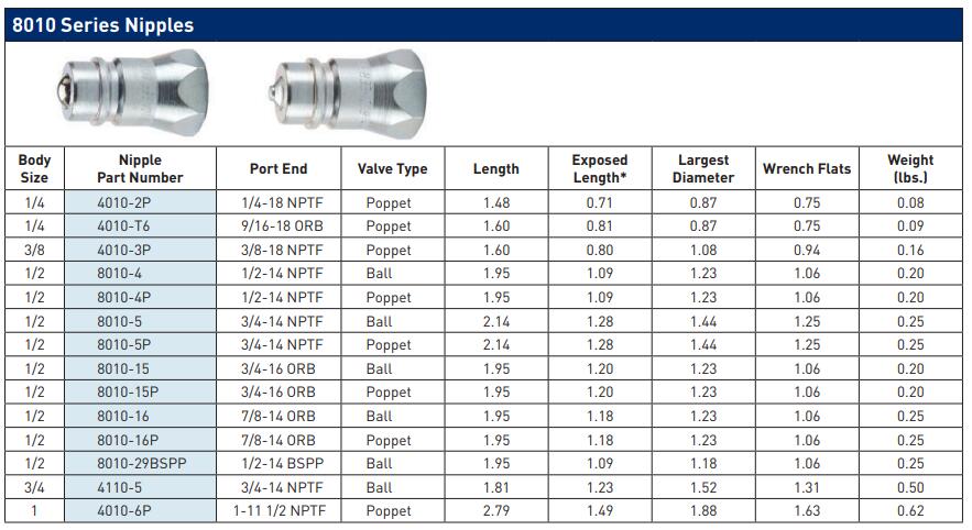 8010 Series Nipples (hydraulic) 3000 psi, connect with 1/2 "" size 4000, 4200, 5000, 8200, 9200,Series Couplers and are interchangeable with other products complying with ISO 5675 requirements. Parker's 8010 Nipples are available with a ball valve, poppet valve, or pressure relieving (connect under pressure) valve. They are the universal standard male tip of the agricultural industry, commonly referred to as the Pioneer tip.