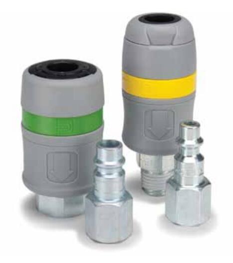 Tool-Mate Series (Standard) Couplers (pneumatic) up to 300 psi, are available in two connection styles to accept either Industrial Interchange Nipples or RF Series (European High Flow profile) Nipples. The connection style is visually indicated by a colored band on the sleeve. Yellow designates Industrial Interchange and green designates European High Flow style. Parker's Tool-Mate Series are non-marking, push-to-connect, single shut off couplers. Coupler bodies are lightweight Polyamide material. Tool-Mate PBH and PER part numbers are NOT pressure venting.