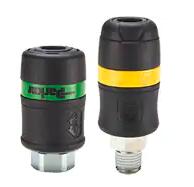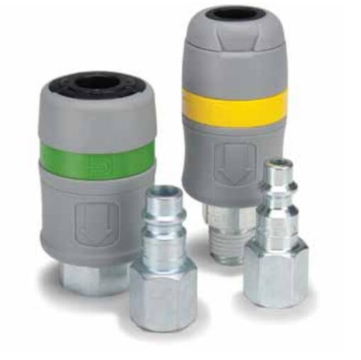 Tool-Mate Series pressure venting couplers (pneumatic, air) up to 300 psi, are available in two connection styles to accept either Industrial Interchange Nipples or RF Series (European High Flow profile) Nipples. The connection style is visually indicated by a colored band on the sleeve. Yellow designates Industrial Interchange and green designates European High Flow.
