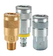 10 Series Couplers (pneumatic) up to 300 psi connect with 10 Series Nipples, Tru-Flate design, also known as the automotive interchange. They have manual sleeves and are single shut off quick couplings. Couplers have an integral sleeve guard to resist accidental disconnection. The steel tubular valve delivers high air flow with minimal pressure drop. Couplers and Nipples are available in a range of sizes and materials to be versatile for use in a variety of applications with air or fluid pressures up to 300 psi.