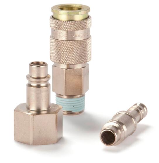 Quick coupling system with nominal diameter 8 for pneumatic and fluid handling applications up to 35 bar. Coupling system with Atlas Copco profile. Available made of brass/steel.